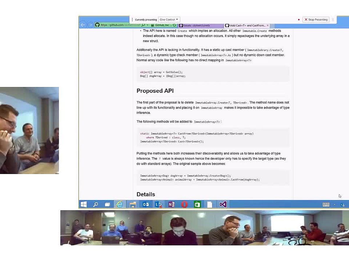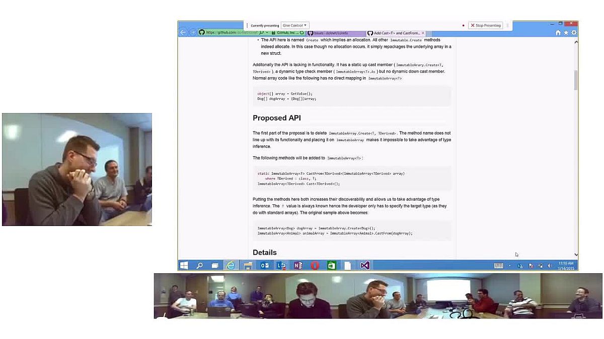 A felvétel ugyanis a cég .NET munkacsoportjának egy közelmúltbeli összejövetelét dokumentálja, amin a jelenlévők munkatársak az új .NET Native API-jainak tervezett bővítéseit, illetve módosításait beszélték át alaposan.