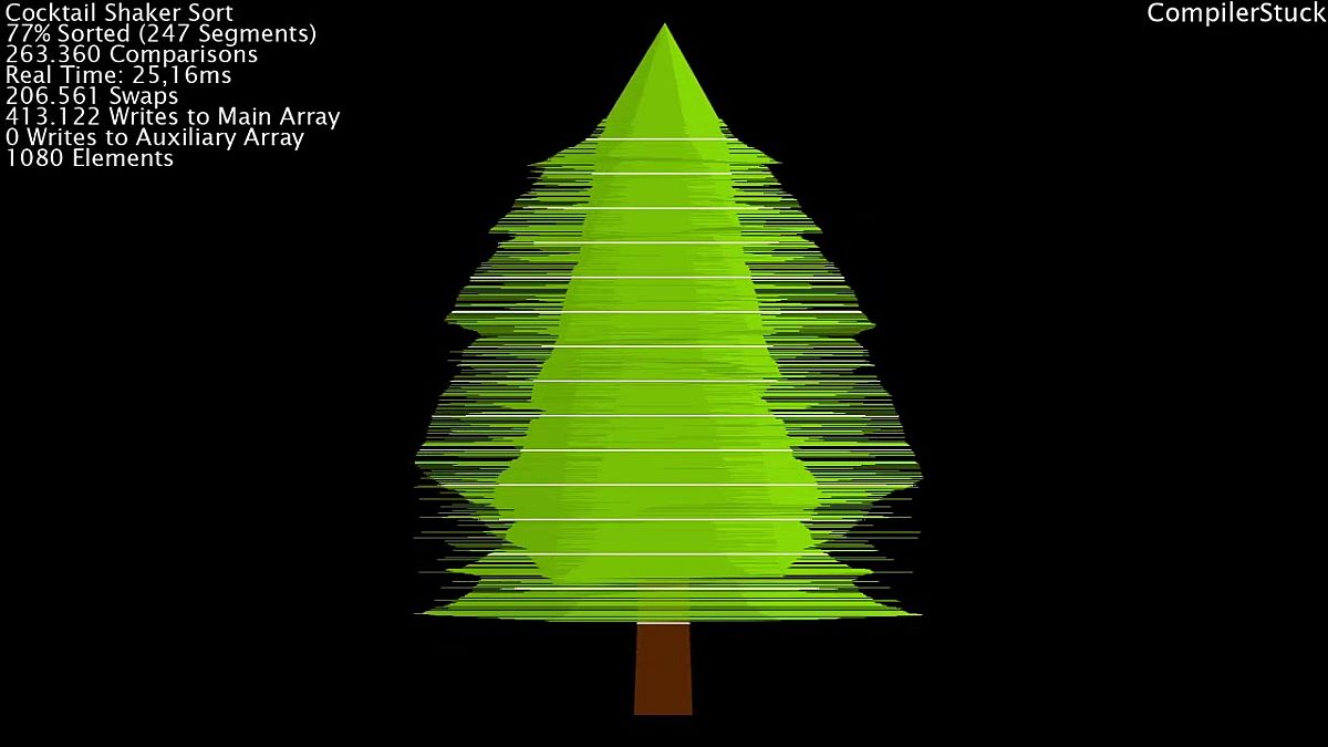 Bár a különböző rendezési algoritmusok működését vizualizáló videók nem számítanak újnak (mi is mutattunk már ilyet), a napokban egy mégis újszerűt kaptunk ebből. Ez ugyanis nem egy szigorúan növekvő adatsort, hanem egy karácsonyfát rendez helyre - illeszkedve az aktuális ünnepi szezonhoz.
