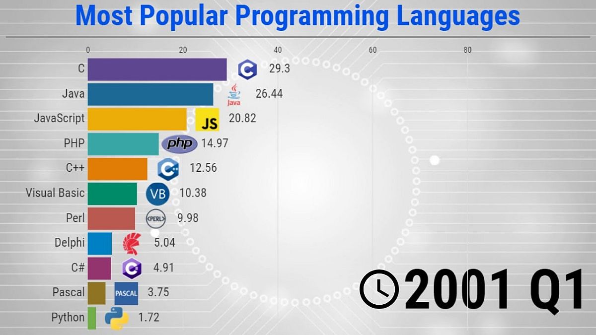 A videó a leggyakrabban használt programozási nyelvek rangsorában bekövetkezett változásokat szemlélteti, 1965-től egészen 2020-ig. Bár hasonló grafikonokat már korábban is mutattunk, az animációs forma jobban szemléltet bizonyos folyamatokat a statikus ábráknál.